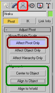 2º- clique na aba "hierarchy" no 3d max, e depois marque "Afect Pivot Only", depois crique em "center to object", e depois em "Aling To Object"